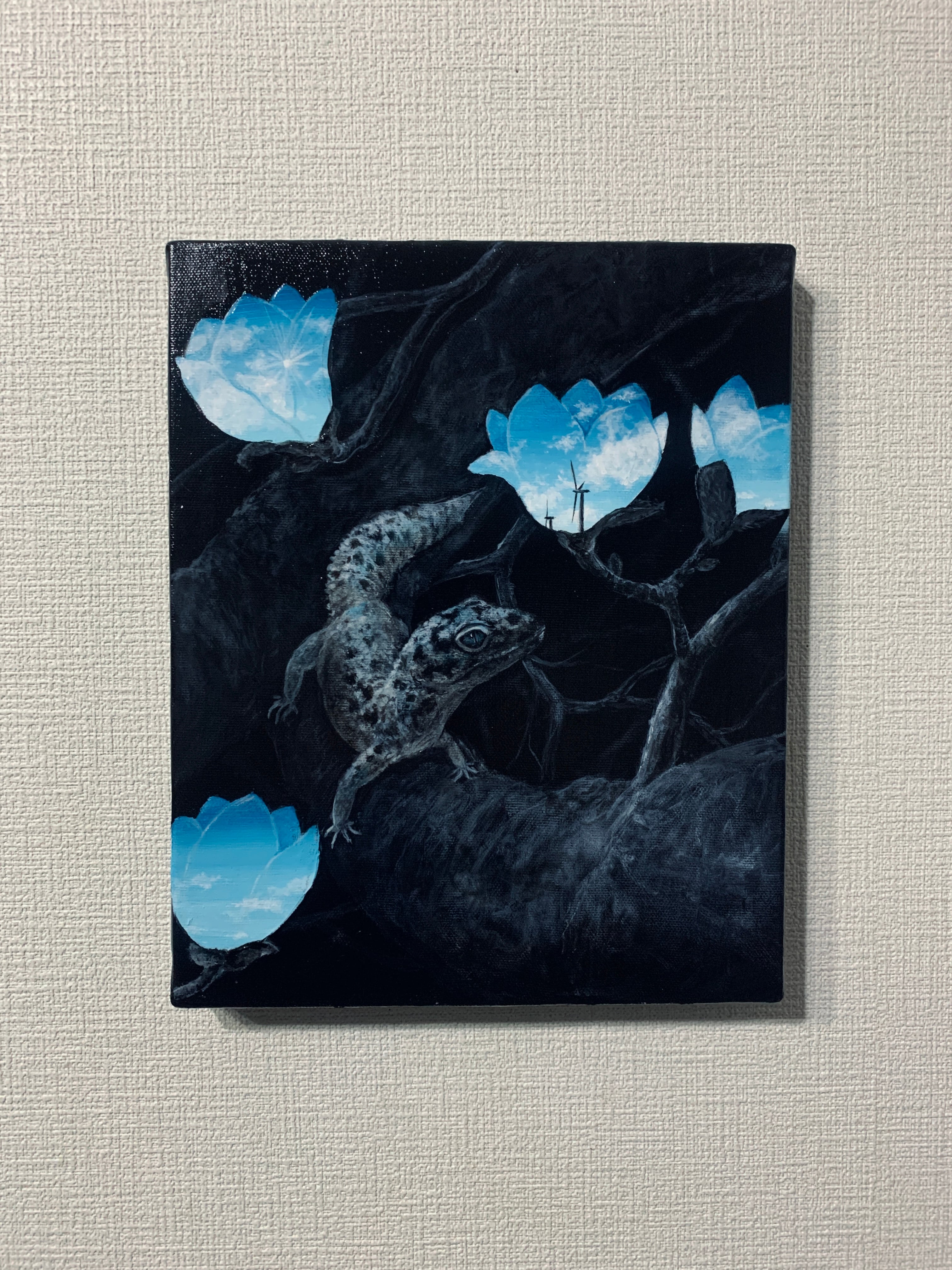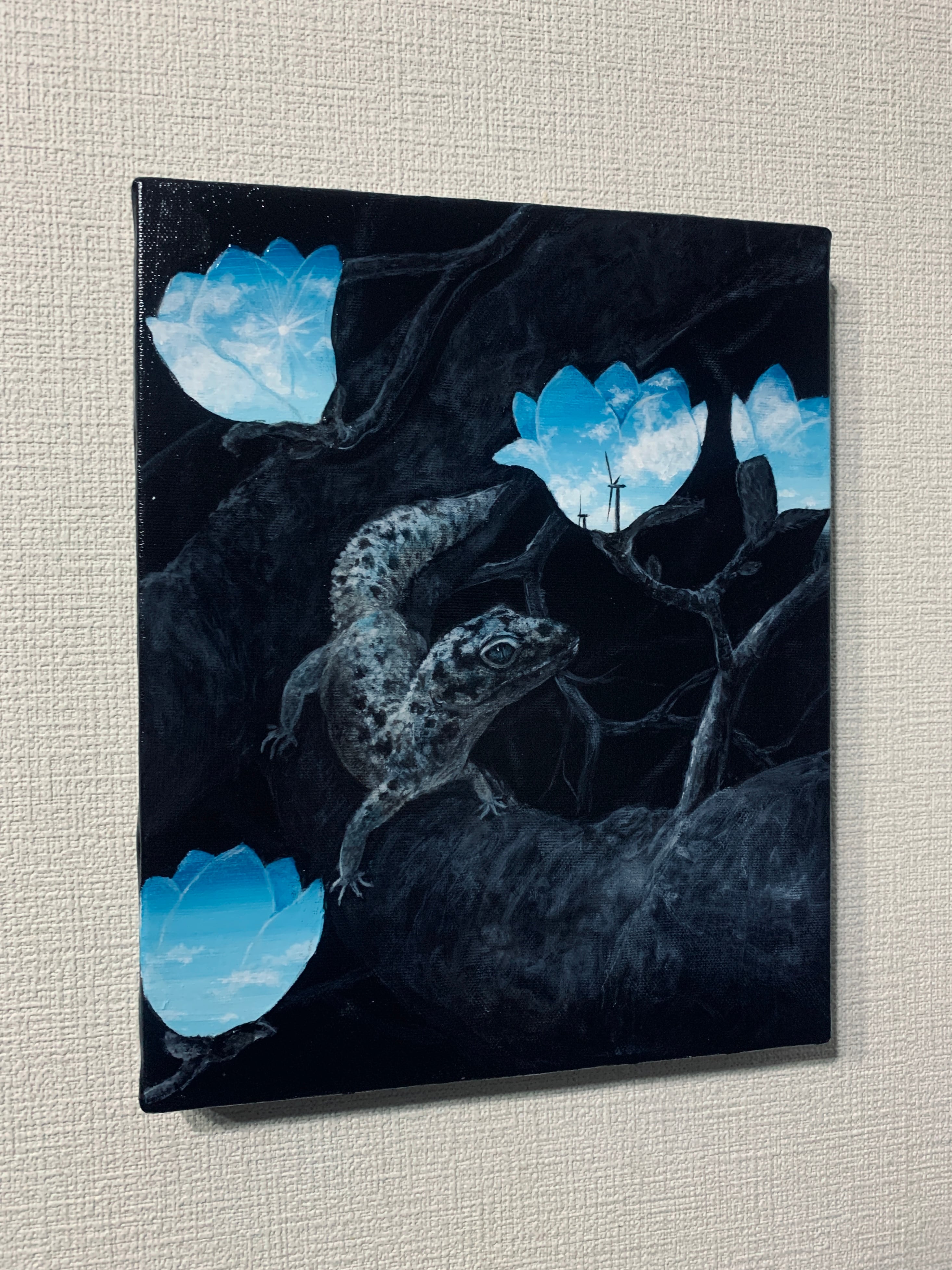 レオパードゲッコーとハクモクレンと青空を合わせた作品の原画となっております。